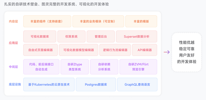 「Zion」的核心技术是自动代码生成(codegen),应用在客户端,实现动态生成实时预览,以及静态生成高性能生产环境,也可以用于服务端;同时,云原生及多云部署也是「Zion」的优势之一,可以实现云边端一体的交付体验;其他优势诸如动态数据存储及更新、自动化运维及发布管道、跨职能多人协同等。