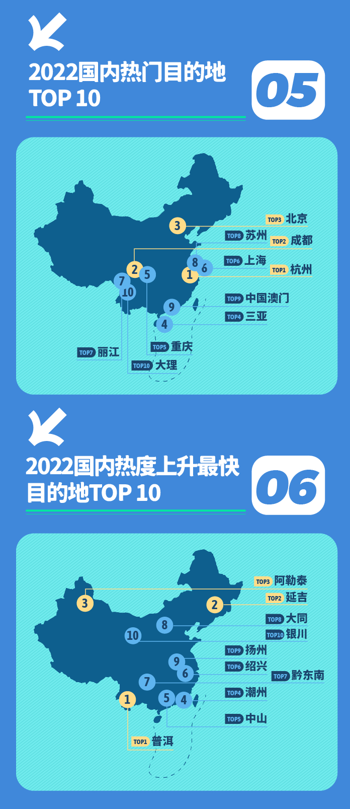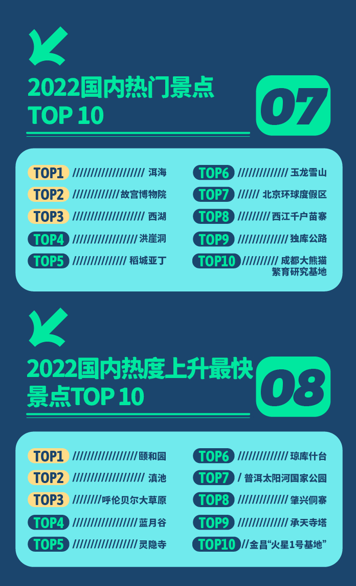 国内年度热门景点方面,洱海成为众多人心中的魂牵梦绕之地,位居榜首。故宫博物院、西湖、洪崖洞、稻城亚丁紧随其后,传说中纳西族保护神“三朵”化身的玉龙雪山吸引更多游客打卡,独库公路成为新疆境内旅行者们的必去之地。2022年,多个老牌景点翻红。颐和园、滇池、呼伦贝尔大草原占据热度上升最快景点前三。有着“小九寨沟”美誉的蓝月谷飞升至第四位,“侗乡第一寨”肇兴侗寨吸引了众人的目光,而金昌“火星1号基地”则凭借为旅行者提供最真实“火星生活”体验关注度猛增。