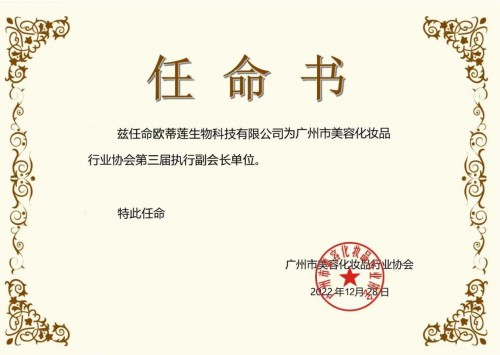在2022年结束之际,非常荣幸“欧蒂莲生物科技有限公司”再次被广州美容化妆品行业协会评为副会长单位,此次已是欧蒂莲连续第三届被任命为副会长单位。