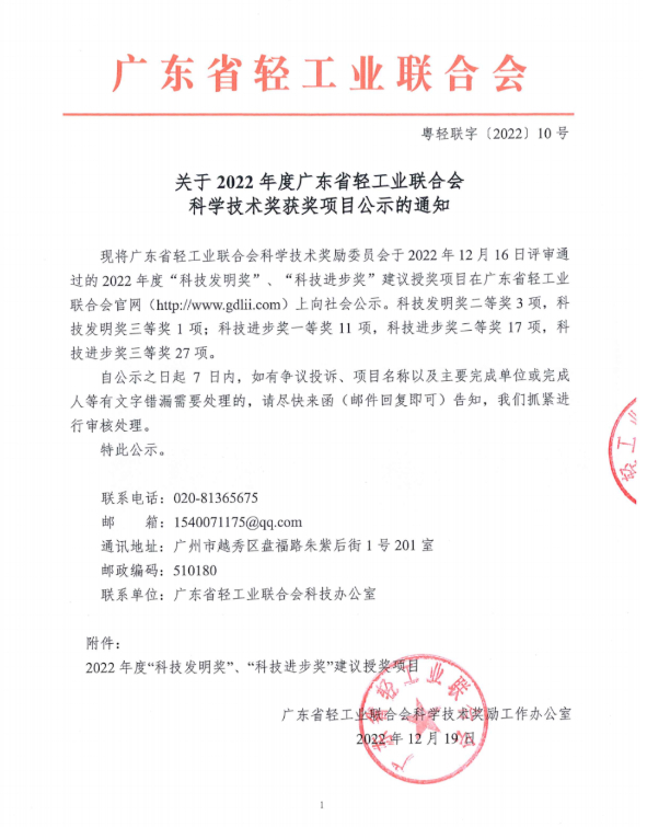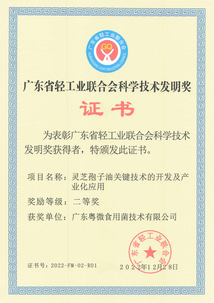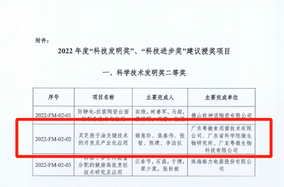 12月19日,广东省轻工业联合会公示了2022年度广东省轻工业联合会科学技术奖获奖项目,广东省科学院微生物研究所、广东粤微食用菌技术有限公司、广东粤微生物科技有限公司的“灵芝孢子油关键技术的开发及产业化应用”项目荣获科学技术发明奖二等奖,创新成果再次获得权威认可。