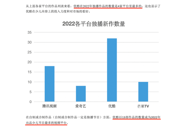 近日,念童少儿观察和艾瑞咨询分别发布《2022少儿独播剧市场分析盘点》《寒假少儿视频内容推荐暨2022年少儿视频内容榜单盘点》,针对2022年各大主流视频平台在少儿内容赛道上的成绩进行了细致分析。从两大机构提供的分析数据来看,2022年优酷少儿无论是在作品数量、内容质量、类型题材还是IP产业化布局方面都具有较强优势,优酷少儿 “内容平台到产业多元化的战略升级”成果颇丰。