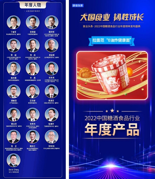 1月10日,由食业头条组织实施的“2022中国糖酒食品行业年度榜单”正式发布,今麦郎董事长范现国入选“年度人物”榜,今麦郎旗下0油炸健康面拉面范入选“年度产品”榜,是所在榜单中唯一上榜的传统方便食品行业人物和企业。或许,新的行业开路人已经出现。