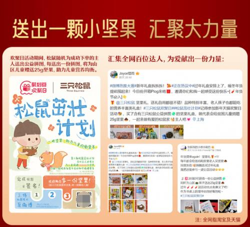 不仅如此,松鼠全球公益行动携手本次天猫欢聚日为爱发声,推出#松鼠茁壮计划#。活动期间,在三只松鼠天猫旗舰店消费满200元可获得公益拼图,即完成一份坚果捐赠(限量10000份,送满即止)。三只松鼠每送出一份拼图,将为山区儿童赠送25g坚果,助力儿童营养均衡。(因临近春节,物流受限,坚果将在春节后完成捐赠。)