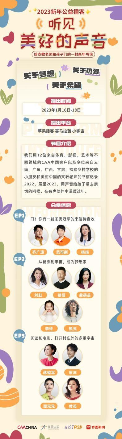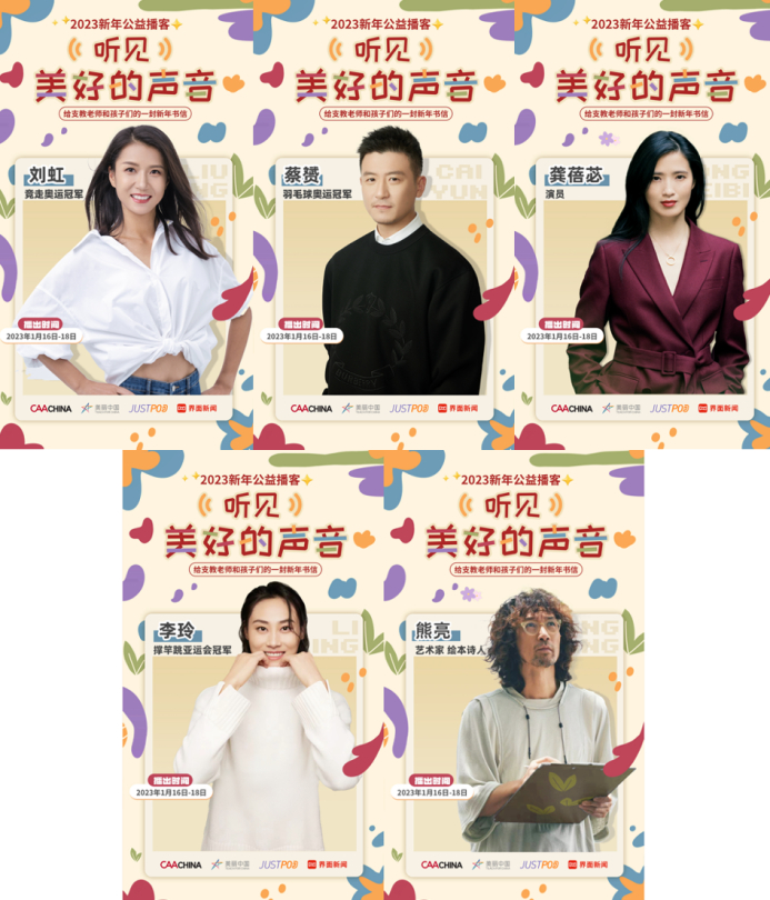 看一部电影,读一本好书,丰富的世界尽在眼前。新年到来之际,CAA中国携手12位来自体育、影视、艺术等不同领域的文体榜样参与2023新年公益播客《听见美好的声音》。在3期节目中,通过书信与乡村儿童及美丽中国的支教老师们进行互动,用书信的方式展开对话,分享书单影单,交流2022年的感悟和2023年的新年计划,在打动人心的亲笔信阅读声中,传递梦想与力量。