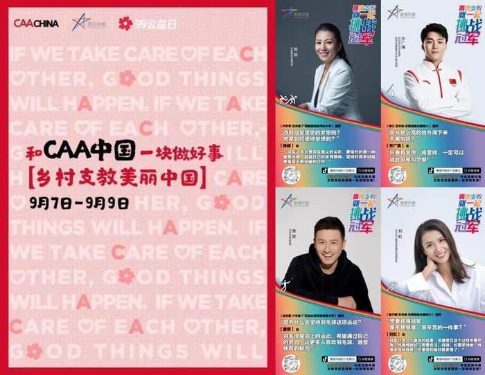 秉持着“照顾好彼此,好事就会发生”的理念,CAA中国长期关注公益事业,携手美丽中国,邀请签约客户及全体员工共同推动中国教育均衡化发展。而今年也是CAA中国与美丽中国展开深度合作的第三年,期间超过100位来自体育、影视、艺术等不同领域的CAA中国客户加入“美丽月捐计划”,每月为乡村孩子捐赠优质课堂。与此同时,CAA中国客户也通过直播连线等多元方式,以个人影响力号召更多社会人士关注与支持乡村支教事业。在“917支教日”当天,杨扬、齐广璞、蔡赟、刘虹4位奥运冠军客户参与“喜欢支教,就一起,挑战冠军”公益直播活动,通过趣味问答、知识科普等多样形式,与乡村孩子们在互动中碰撞热爱与梦想。此外,CAA中国也在开学季邀请员工一起做好事,在“99公益日”活动期间,共为孩子们筹集到4193节优质课堂,可支持524位乡村孩子们一天的优质学习。CAA中国将持续与美丽中国探索更多公益合作的可能,用小善成就大爱,共同传递力量与温暖。