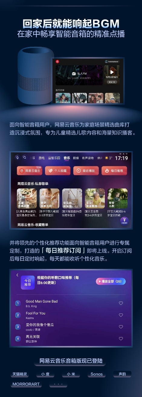 面向智能音箱设备,网易云音乐也拓展巩固了自己的服务范围和领域。针对这一使用场景,网易云音乐为家庭场景精选曲库打造了沉浸式氛围,专为儿童精选儿歌内容和海量知识播客。并将领先的个性化推荐功能面向智能音箱用户进行专属定制,打造的「每日推荐订阅」即将上线,开启订阅后每日定时响起,每天都能收听个性化音乐。目前,网易云音乐与天猫精灵、小度、小米、Sonos、声韵、MORRORART等音箱品牌达成合作。