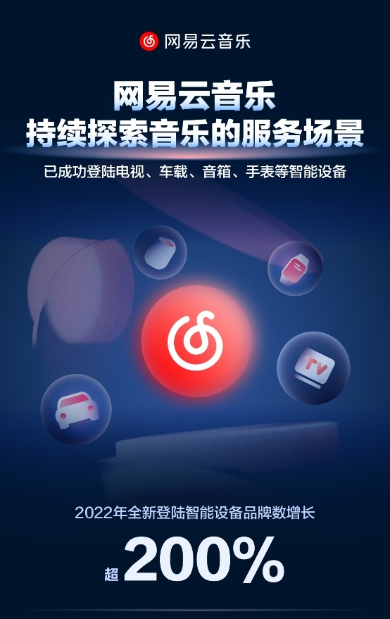 2023年1月18日,网易云音乐发布了2022年IoT多终端业务年度战报,从电视、车载、音箱、手表等不同智能设备场景盘点了其过去一年的表现。战报内容显示,2022年网易云音乐全新登陆智能设备品牌数增长超200%,围绕出行、家庭、运动等生活场景实现了全面布局,为用户从生活的更多方面提供了领先的音乐服务。