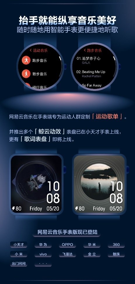 在手表端,网易云音乐也持续为习惯移动听歌的用户提供更优质服务。2022年,网易云音乐在手表端专为运动人群定制了运动歌单,让他们在撸铁时也能尽享音乐动力;同时,也面向手表端推出多款「鲸云动效」表盘,相关功能已在小天才手表上线。此外,网易云音乐也联合相关合作伙伴在业务合作之外为社会公益事业尽了自己的一份力。去年4月,为抗击疫情,网易云音乐联手小天才手表为用户送去200万份会员福利,让孩子们在居家学习时也能享受音乐的陪伴。目前,网易云音乐已登陆小天才、华为、OPPO、华米、360、小米、vivo、飞亚达、金立、魅族、出门问问等品牌,未来仍将在手表端拓展更多合作。