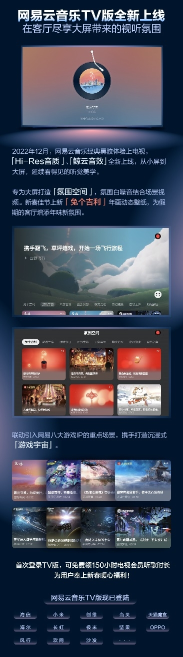 目前,网易云音乐TV版已登陆海信、小米、创维、当贝、天猫魔盒、海尔、长虹、极米、坚果、OPPO、风行、欢网、沙发等应用商店。随着TV版的上线,从家中娱乐,到家居休憩,再到家庭聚会,网易云音乐都能帮助用户更好地解锁客厅场景新玩法,让所有用户在客厅里以更多样的形式享受到视听上的非凡体验。春节期间也为TV用户带来了新年福利 ,TV版新用户首次登录即可领取150小时电视会员听歌时长,无不体现着网易云音乐的用户关怀。