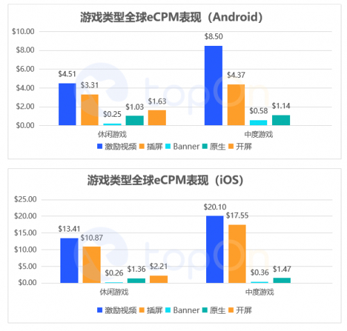 整体来看,中度游戏eCPM表现优于休闲游戏。从广告样式看,激励视频优势最为明显,激励视频>插屏>开屏>原生>Banner。同类型游戏中,iOS的eCPM较Android更高,其中iOS的激励视频和插屏优势更为明显。