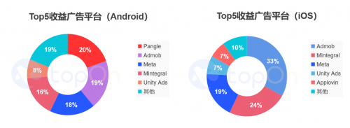 在全球广告平台收益方面,穿山甲平台凭借着TikToK在海外的风靡,在日韩、巴西市场有着良好的表现,在Android端收益占比排名最高,达到了20%;而Mintegral则凭借深耕游戏市场流量,在iOS端的收益占比排名升至第二,占比达到24%。二者在全球的广告收益不断向Meta、Admob等传统大媒体逼近。
