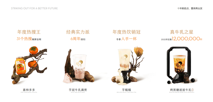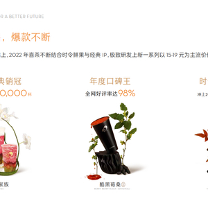 一直以来,喜茶都通过各种品牌活动,为消费者带来激发生活喜悦的品牌体验。《喜茶这十年》报告显示,2022年喜茶与藤原浩、梦华录、原神、只此青绿、甄嬛传等经典IP联合展开的品牌活动,持续为消费者带去惊喜,不断赢得用户口碑。而自2012年诞生以来,喜茶就一直以每一条品牌内容、每一款设计、每一间门店传递一份喜悦,也直接带动茶饮行业从街边小店进化到品牌化时代。