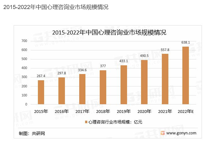 根据共研网相关数据,2022年中国心理咨询业市场规模为638.1亿人民币。