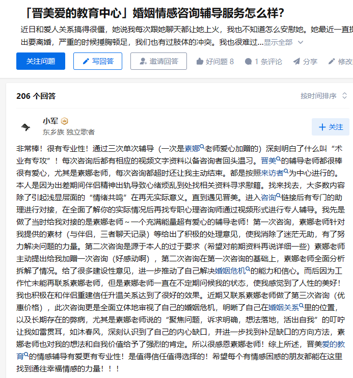 在知乎上,有一条晋美服务过的客户留下的评价专区。