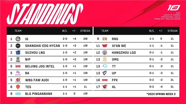 截止到1月18日,17支焕新阵容的队伍均完成亮相,选手们也以崭新的竞技面貌为观众们带来诸多惊喜。目前,iG以2-0的全胜战绩领跑积分榜,上海EDG合创汽车、苏州LNG、深圳NIP则位列第二。