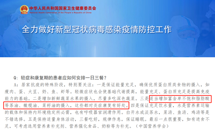 凭借丰富的营养和健康功效,山茶油被大力推广。《中国食物结构改革与发展规划纲要》中提倡推广山茶油为食用油。它也是国际粮农组织首推的卫生保健植物食用油。在近几年特殊环境下,就连卫健委也在《新冠肺炎防治膳食指导》里建议:“适当增加富含单不饱和脂肪酸等茶油、橄榄油、茶籽油的摄入,这些都对炎症康复有好处。”