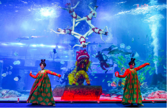 正佳广场联手《唐宫夜宴》IP,在广场内原汁原味地还原了《唐宫夜宴》唐风演艺。当《踏歌祈福巡游》、《霓裳羽衣舞》《红衣飞雪》等节目呈现在眼前的时候,游客一秒穿越回盛唐。而《水下唐宫夜宴》又是对原IP的一次充满想象力和创造力的再创作,多名唐宫仕女在吉尼斯纪录深海实景展缸内外翩翩起舞,水下的高难度中国风舞蹈动作令人惊叹不已,在这里,海洋和唐风舞蹈,碰撞出了一个颠覆想象的奇妙异世界。