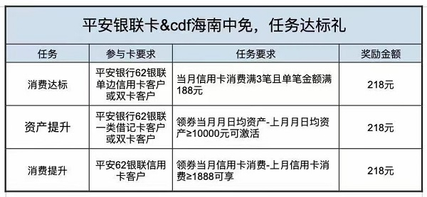 1月13日-3月31日期间,持有62开头的平安银联卡(信用卡/借记卡)去指定免税店线下消费即可参与,适用门店包括cdf三亚国际免税城、cdf海口国际免税城、cdf海口日月广场免税店、cdf海口美兰机场免税店、cdf三亚凤凰机场免税店、cdf琼海博鳌免税店。活动分为月月领及达标领两类: