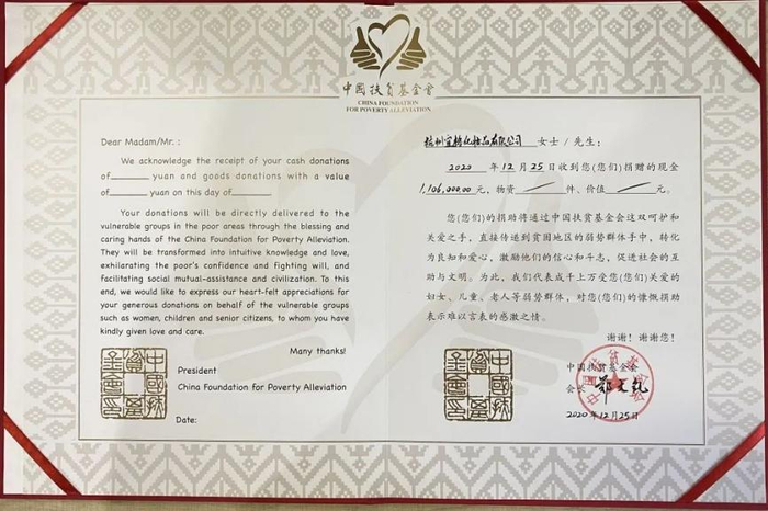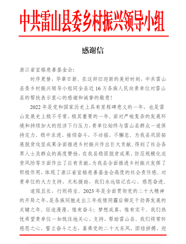 2023年新年伊始,花西子收到了两封特殊的感谢信,这些信来自中国共产党雷山县委、雷山县人民政府和中共雷山县委乡村振兴领导小组。作为苗族孩子们的“大家长”,信中对花西子母公司旗下的的浙江宜格慈善基金会表示了衷心的感谢和诚挚的敬意。信中写道“贵单位始终与雷山县群众一道保持定力、稳中求进、接续奋斗,不动摇、不懈怠。为我县巩固拓展脱贫攻坚成果全面推进乡村振兴作出巨大贡献。得到了社会各界人士及群众的高度赞扬,在我县稳固脱贫成果、防范规模化返贫风险等方面作出了应有贡献,为我县全面推进乡村振兴发挥了积极作用,体现了浙江省宜格慈善基金会高度的社会责任感。”