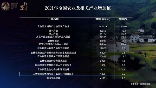 12月30日,国家统计局公布了2021年农业及相关增加值GDP占比情况,并依据最新农业及相关产业统计分类(2020)第首次公布了农林牧渔业休闲观光和农业农村管理服务的增加值。在10个产业相关大类中,农林牧渔业休闲观光和农业农村管理服务增加值占比位列第五,农业休闲观光服务背后正是广阔的乡村旅游休闲市场。