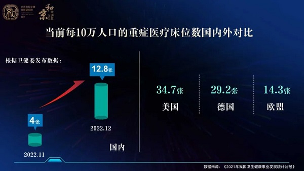 疫情背景凸显了我国医疗资源总量和结构性不足的矛盾。 2021年末,我国有医疗机构1014360个,其中医院36570个,基层医疗卫生机构977790个,专业公共卫生机构13276个[4]。值得注意的是,近五年来,与医院数显数量的增势相比,社区卫生服务中心、乡镇卫生院等基层医疗卫生机构数量不增反降。经过有效调配和床位重组,目前我国重症床位资源总体能够支撑需求,但与发达国家相比仍有差距。根据卫健委发布的最新数据,我国每10万人口的重症医疗床位数由11月份的不到4张提升12月底的12.8张。国外调查显示,美国、德国、欧盟每10万人口拥有的重症床位数分别是34.7张、29.2张和14.3张。