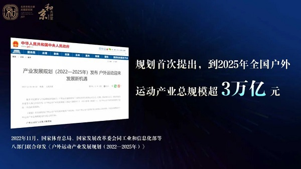 2022年11月,国家体育总局、国家发展改革委会同工业和信息化部等八部门联合印发《户外运动产业发展规划(2022—2025年)》。该规划首次提出,到2025年全国户外运动产业总规模超3万亿元。