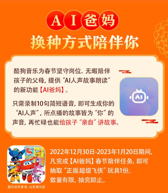 春节期间,酷狗音乐也关注到许多父母仍坚守岗位,无法陪伴孩子,因此,本次公益企划还推出了“AI爸妈”云陪伴活动。这个活动基于酷狗自主研发的声音AI技术,父母只需录制10句简短语音,即可合成AI人声,让他们的声音可以随时为孩子讲故事。AI爸妈这项神奇的“声音克隆”功能,已经成为宝爸宝妈们的“哄娃神器”。本次公益活动中,酷狗音乐为爸妈们设置“春节陪伴任务”,完成后即可为自己宝贝抽取一套玩具,让爸妈换种方式陪伴宝贝。
