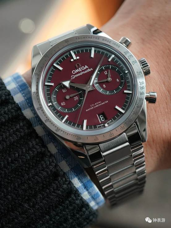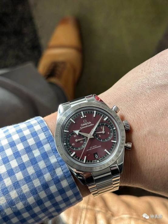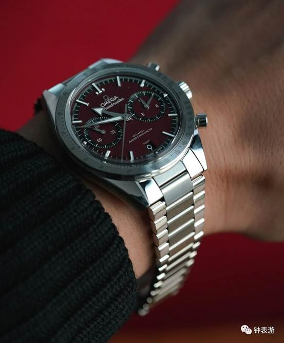 ▲阳光照耀下,最新款欧米茄超霸’57腕表勃艮第红色盘面表款呈现出更亮的色彩