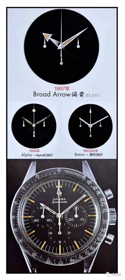 ▲欧米茄超霸表自1957年诞生后,经过了几代更新。到1969年登月的第四代超霸(1965年已定型制造出来),指针主要样式就经历了阔箭针到Alpha针、然后到棒棒针的变化