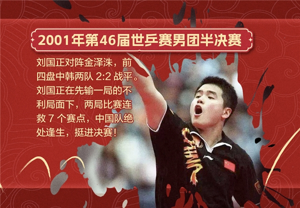 此后,一代又一代的国乒人传承着乒乓球队“球不落地,永不言弃”的体育精神,创造了一场又一场经典比赛。2001年第46届世乒赛男团半决赛,刘国正对阵金泽洙连救7个赛点,帮助中国队绝处逢生,挺进决赛;第47届世乒赛女团小组赛,张怡宁11:0横扫韩国选手李恩实,展现王者风范;2012年伦敦奥运会乒乓球男单决赛,张继科实力夺冠,成为中国男乒历史上第三位大满贯选手。2016年里约奥运会乒乓球男单1/8比赛,马龙在大比分0-2落后的情况下沉着应对逆转郑荣植,这场比赛成为其职业生涯的转折点。或是横扫千军,或是绝处逢生,国乒用傲人的成绩成为了当之无愧的王者之师。