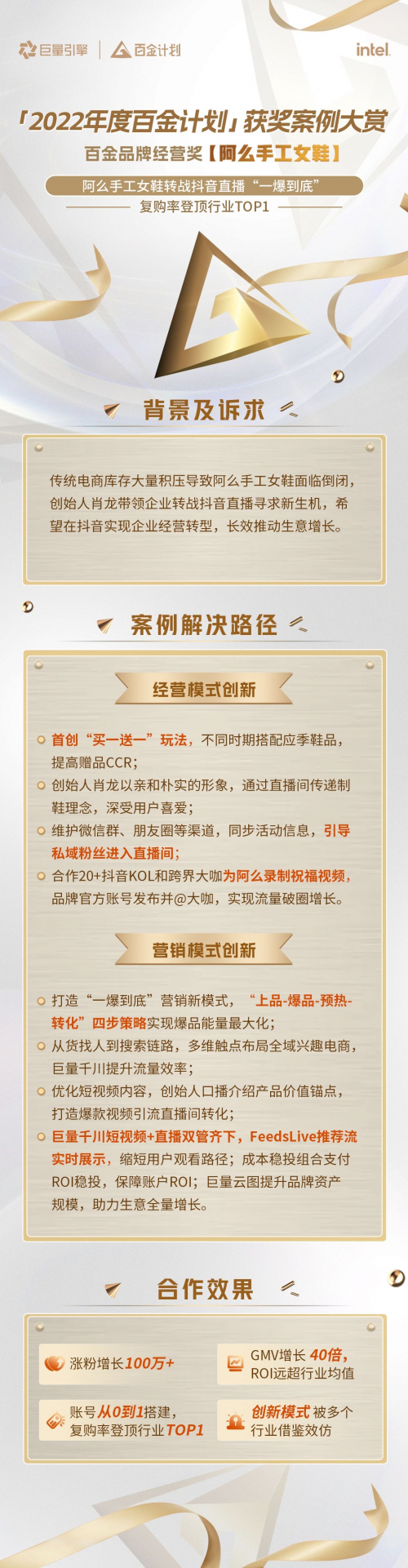 濒临倒闭的企业如何涅槃重生?阿么手工女鞋大胆尝试抖音直播,其首创的“买一送一”、强调“手工”,以及“一爆到底”等模式,不仅给垂类商家树立了经营转型、高速增长的标杆案例,同时还为其他行业提供了可供参考的创新思路,有力证明了走入瓶颈期的商家可以在抖音突出重围,实现生意新突破。