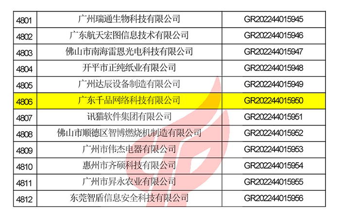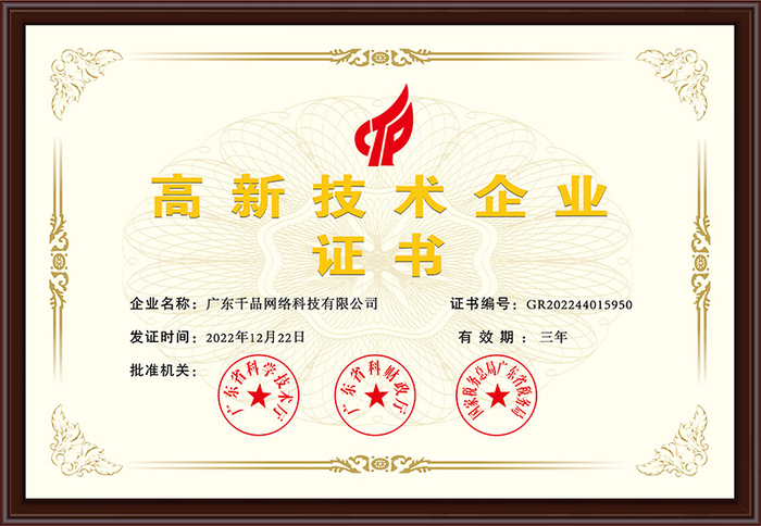 2022年12月22日,全国高新技术企业认定管理工作领导小组办公室发布了2022年国家第三批高新技术企业认证名单,广东千品网络科技有限公司成功上榜,正式迈入国家高新技术企业行列。