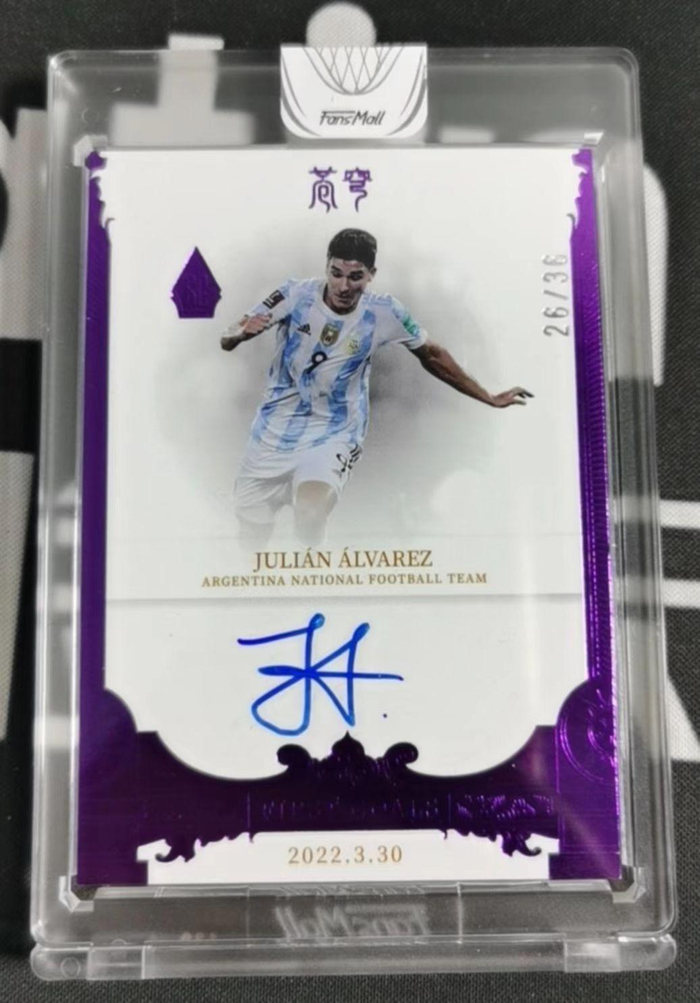 FansMall非常荣幸这次能够在发行阿根廷国家队球星卡过程中拿到阿尔瓦雷斯的全球首签,同时也证明了中国球星卡发行公司的实力,相信在阿根廷拿下世界杯冠军之后,阿尔瓦雷斯在之后会有更加亮眼的表现!