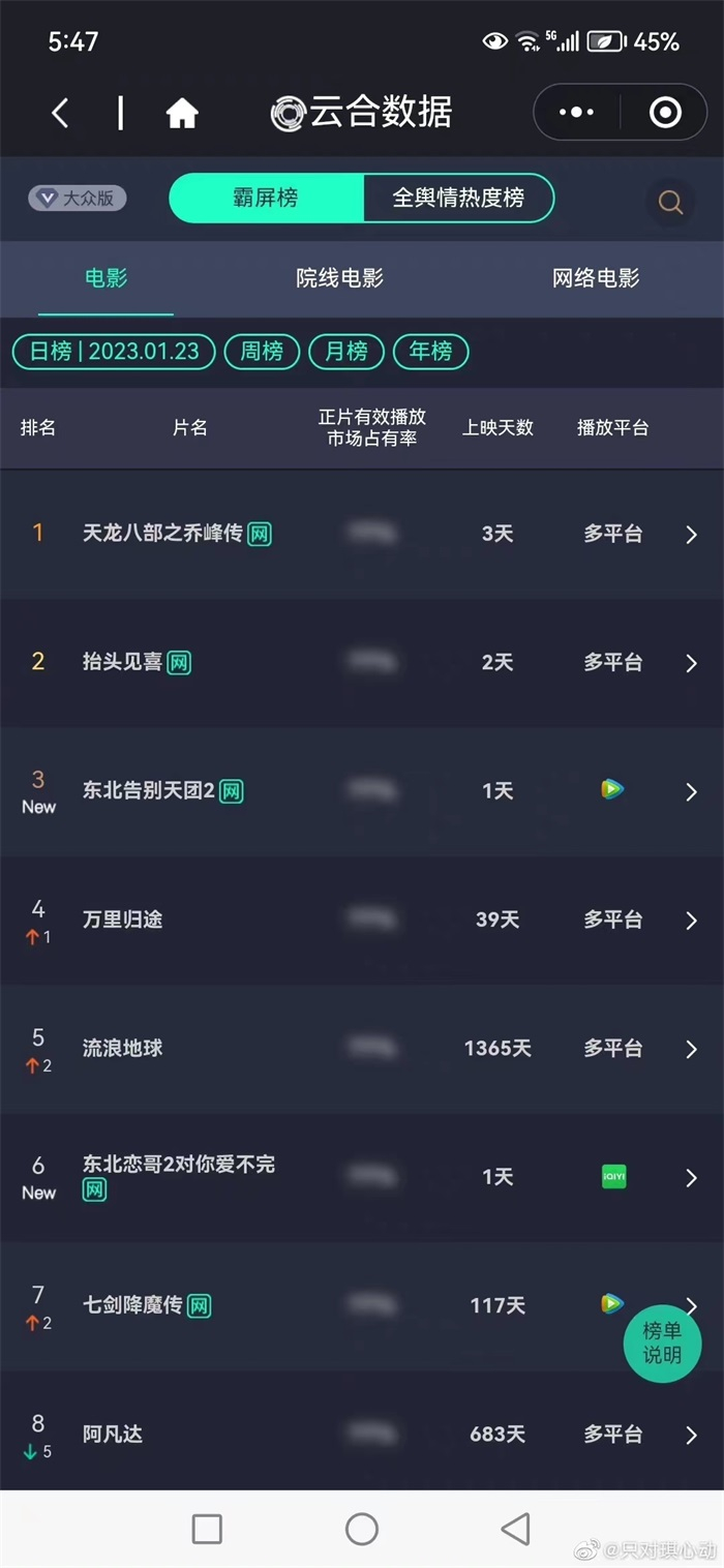 《天龙八部之乔峰传》于2023年1月21日在爱奇艺、腾讯视频和优酷视频播出,位列网络电影实时热度榜第六名,截止1月23号上映三天内,在大陆正片有效播放市场占有率排名第一,远超排名前三的《抬头见喜》、《东北告别天团2》。目前依然呈上升趋势,优酷评分狂飙至8.7分。在微博、豆瓣等平台连续日关注度过万,站内热度值持续增加。