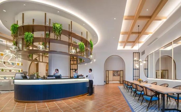 蓝白花纹经典搭配,高大通透的公共空间复刻古希腊式厅堂。简约朴素的原木绿植、休闲藤编搭配明媚金黄营造自然与舒适的和谐氛围。而且酒店客房内配套设施一应俱全,三秒热水淋浴花洒、愉梦之床、百兆光纤无缝接入、WIFI全覆盖。