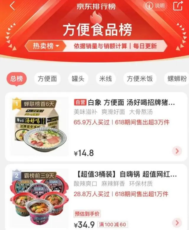 京东618预售期内,白象汤好喝招牌猪骨面便以超3万件的销量位居榜首,超方便食品榜第二名近3倍,累计购买人数也达后者的2倍多。