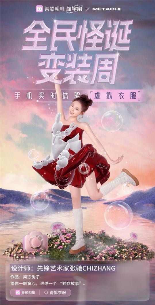 美颜相机与先锋艺术家张驰CHIZHANG等的合作款虚拟衣服,让昔日距离普通人生活格外遥远的“时尚”变得触手可及,设计感十足的秀场款一键轻松上身,用户从旁观者变成亲历者,拉满使用体验。与张驰CHIZHANG联名推出“果冻兔子”虚拟衣服,讲述人与动物和谐共生的故事,实用与美观并存。美颜相机还联手天线宝宝、迪士尼等知名IP,上线玩偶服、迪士尼公主裙等经典服饰,无论是小波的红色玩偶服和粉色芭蕾裙,还是公主们蓬松梦幻的裙摆,无不唤醒童年记忆。美颜相机的虚拟衣服让瞬间变身不再是童话中的魔法,用科技实现儿时幻想。
