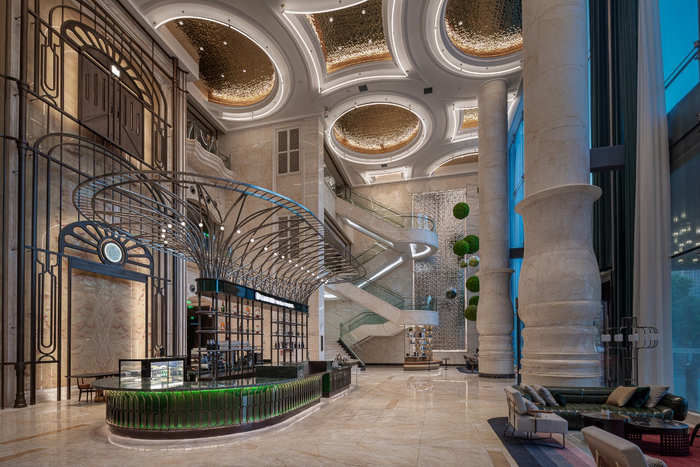 苏州吴中万达美华保留了原有建筑石材,将时光印记融入ArtDeco风格,彰显着历史赋予其的韵味,也燃起了时尚的复古特质。置身其中,便能感受到大堂空间大气包容、悠扬且摩登。