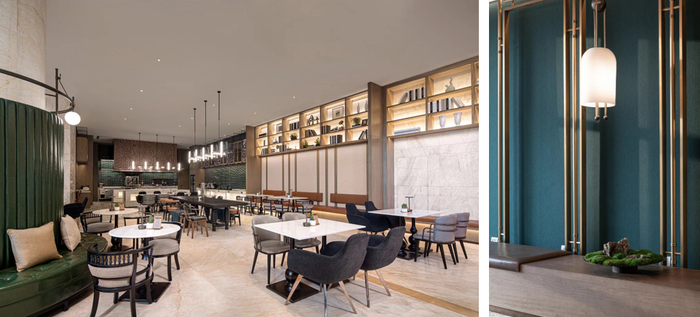 服务岛台的外侧,则以绿色亚克力砖镶嵌,增添一份复古与华贵。在多功能服务岛台的背后,是一扇金属屏风,呈现一幅巨大的金属门造型,寓意为“穿越时空之门”,在大理石的映衬下,稳重的空间质感呈递了美华的设计风貌。兼具早餐及咖啡的休闲区,长桌、皮椅,书架环绕,而在酒店大堂的另一侧,被打造成了相对安静的阅读书吧,呈半圆形的书架甚是独特,午后闲时,可将时光付诸于对一本书籍的研磨,体察书面文字的温度,感受岁月凝练的包容。
