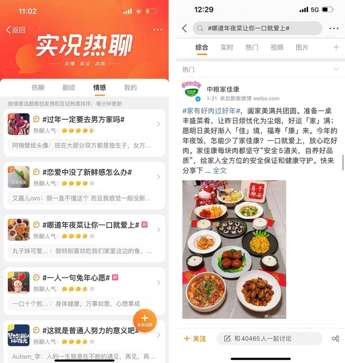 借势央视国媒的受众广度和除夕年夜饭的话题热度,以口口相传的方式,家佳康适时再造一波自来水热议高潮。除夕当晚,微博话题#哪道年夜菜让你一口就爱上#讨论量达4.5万,阅读7834.5万次,登上实况热聊榜,“安全更健康的好肉品质”成为网友讨论家佳康的热点内容,助力品牌传播声量不断放大,有效提升家佳康品牌在消费者心目中的强认知占位。