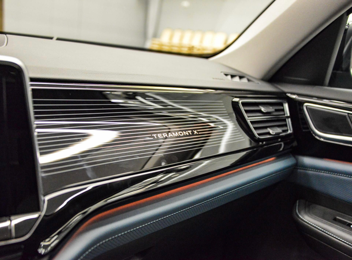 外观设计方面,途昂X在运动感营造上略胜一筹,坐进车内又一次靠细节取胜。虽然二者中控台都有不错科技感,揽巡采用了双联屏设计,不过偏向驾驶位一侧不太利于副驾驶日常操作,而途昂X标准的T字型中控台布局在满足科技感同时,也不缺乏便利性。尤其是选择青云限定版还有专属碧空青内饰配色,搭配上副驾驶X-ray镭射光束饰板,点亮时的线性状视觉效果极具科技感与豪华感。