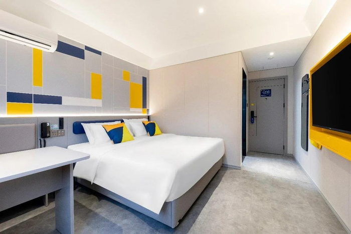 深入房间内部,无论是大床房还是双床房,床头背景墙统一沿用7天酒店3.0标志性蓝黄撞色几何造型风格。床靠背板则采用暖灰色免漆板+床头软包的组合方式,造价更低、更加简洁大气、体验更舒适。床边还有简洁、实用的延伸座椅,让整个空间显的格外的简雅舒适。此外,正对床的电视墙颜值同样非常的高。定制的黄色电视框线条更加简洁,旁边的挂衣杆、穿衣镜和隐藏式灯带布局紧凑,非常实用。既恬逸又现代,勾勒出别致的客房场景。