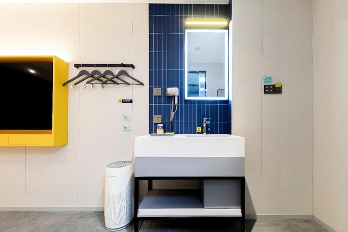 在看到样板间房型A的第一眼,依然是熟悉的黄蓝色彩几何造型搭配,明亮且充满活力,但又感觉和过去相比更显简洁大气。墙板采用了统一的暖色调布纹WPC墙板,营造温暖、现代的氛围。进入房间,左侧是一体式洗漱台,蓝色洗漱台背景墙再次突出了品牌的主色调,墙上镶嵌了简洁实用的洗漱镜,加上可调节角度的壁灯,无论是白天光线充足,还是夜晚光线暗淡,都可以在这里整理出最精致的妆容。右侧通过封闭式玻璃隔断出卫生间,卫生间造型更加简洁、商务,既保证了干湿分离的基础需求,造价也更低、适配性更强。LVT材料的地板,施工更快、防水耐用。