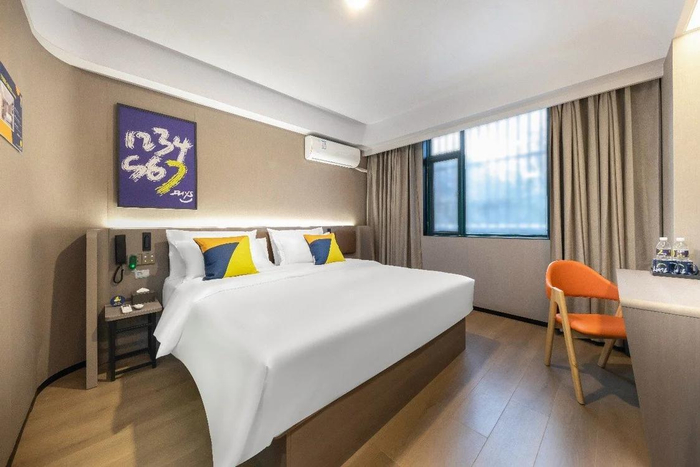 该房型以现代简约的暖灰色调为主色系,点缀7天酒店3.0品牌色蓝色和黄色,通过深蓝色品牌定制挂画和黄色电视框提亮整体空间氛围感,整体风格更加简洁大气、充满商务风。