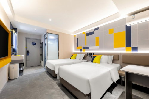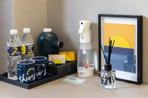 另外,7天酒店还推出了迎合海外市场拓展的商务风格房型。在房型B样板间中,现代简约的暖灰色调为主色系,点缀7天酒店3.0品牌色蓝色和黄色,搭配品牌装饰背景画,提供更多选择。