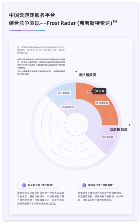 2022年11月,在弗若斯特沙利文(Frost & Sullivan,简称“沙利文”) 联合头豹研究院发布的《2022年中国云游戏服务平台市场报告》中,元境位居云游戏服务平台Frost Radar (弗若斯特雷达) “领导者”象限,凭借增长与创新指数双双位居排名第一,荣登中国云游戏服务平台榜首。