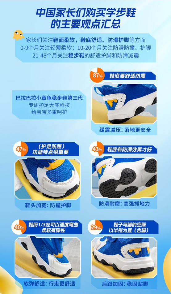 为此,“如何帮助宝宝度过学步困扰期“,正是家长们迫切需要解决的问题。白皮书显示,中国家长在协助宝宝学步时,主要通过扶走、爬行训练带宝宝学步,超4成的妈妈会选择使用学步产品。其中,学步鞋是中国家长了解且购买最多的学步产品,认知渗透率超80%,其次是学步车和学步带。从家长购买学步鞋的主要观点来看,主要关注鞋面柔软,鞋底舒适、防滑护脚等方面。宝宝在0-9个月,更关注轻薄柔软;宝宝在10-20个月,更关注防滑防撞、护脚,宝宝在21-48个月则更关注稳步鞋的舒适护脚和防滑减震。作为懂成长的儿童时尚品牌,巴拉巴拉婴童鞋专为中国宝宝研发设计15年。巴拉巴拉小章鱼稳步鞋第三代专研护足大底科技,给宝宝带来了多重呵护。