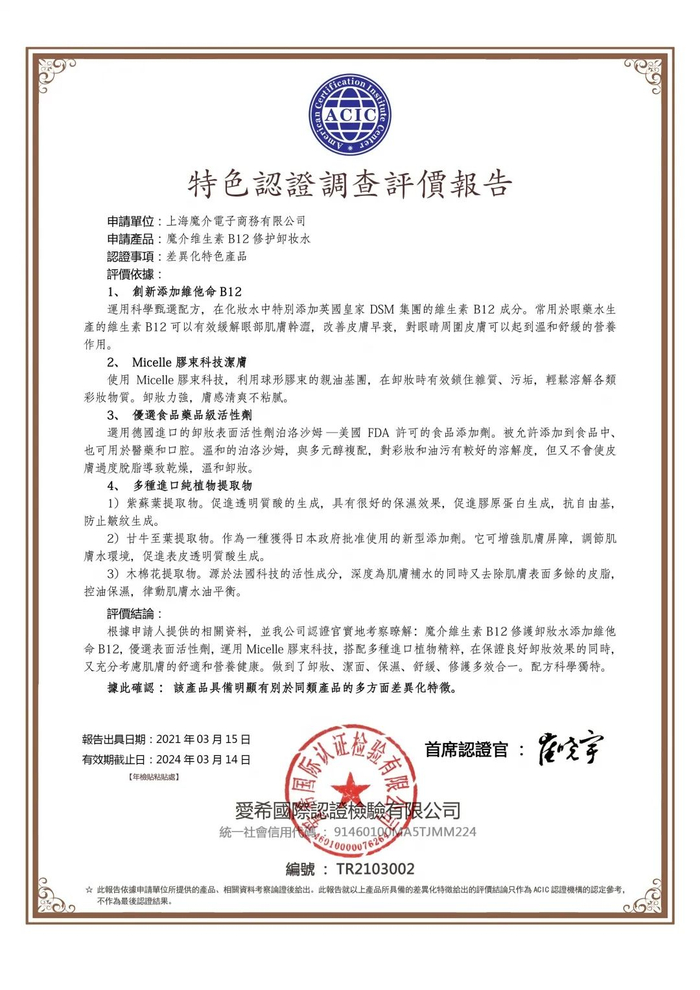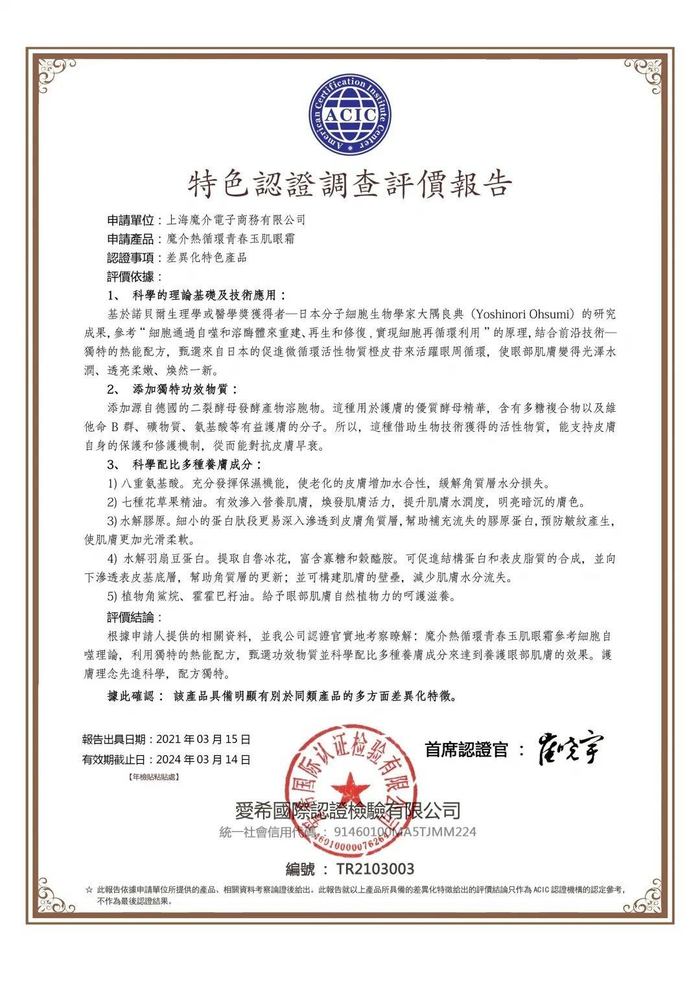 继网络热门产品——“奢貌羊奶皂”经ACIC特色认证加持成为爆款流量产品后,又一化妆品行业的时尚引领者——上海魔介电子商务有限公司把多款产品向我认证中心提出申请认证,经我中心认证专家组研究讨论后,认为其中“魔介热循环青春玉肌眼霜(现改名为:魔介淡纹抗皱精华眼霜)”、“魔介维生素B12修护卸妆水”两款产品具备明显有别于市场上同类产品的多方面差异化特征,严格按照认证流程通过了差异化特色认证。