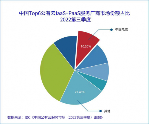 近日,IDC发布的《中国公有云服务市场(2022第三季度)跟踪》报告显示,在中国公有云IaaS+PaaS市场中,中国电信天翼云以10.2%的份额排名再进一位,升至行业第三,份额较上期增长0.4PP,同比增长1.3PP。