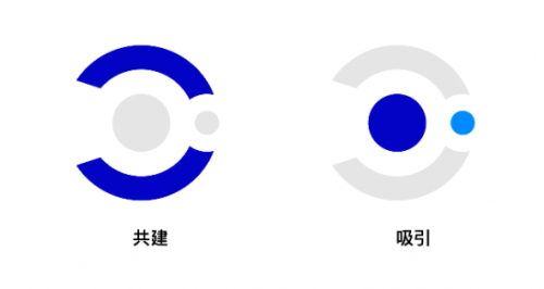 所以自此,蓝色磁场会用圆环代表磁场,上下两个圆环代表“共建”,中心一个圆点吸引周围圆点来代表“吸引”,形成了我们现在的主标识。